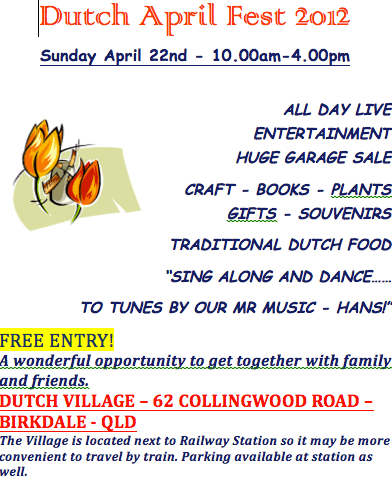 Is on Sunday 22nd April 2012 from 10am-4pm at Prins Willem Alexander Village, 62 Collingwood Road, Birkdale, Brisbane. See the flyers below for more information on this fun family day out. See you there!